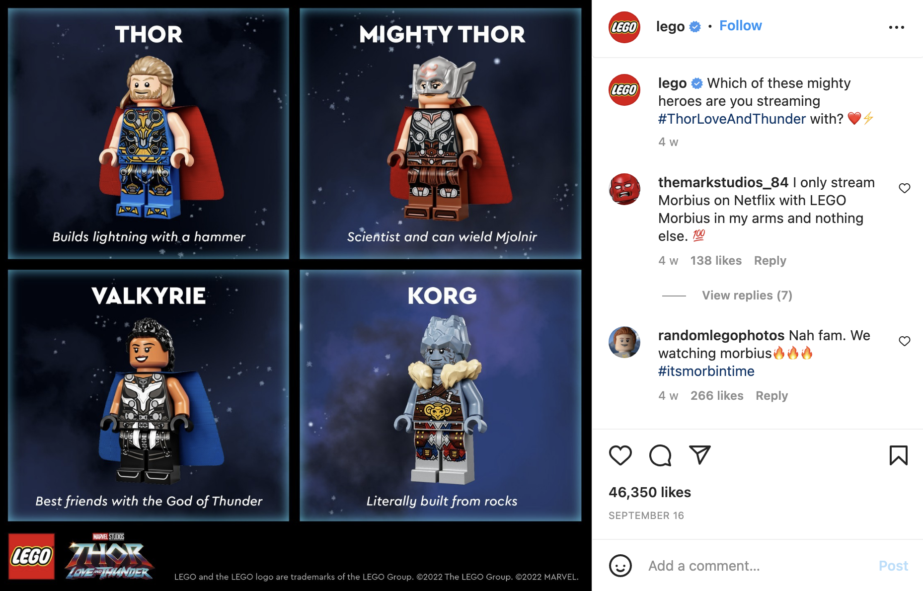 Lego is a brand that regularly collabs with other brands like Marvel. As a result, two brands promoting a single campaign could yield much better results if it were just a single brand doing all the work.