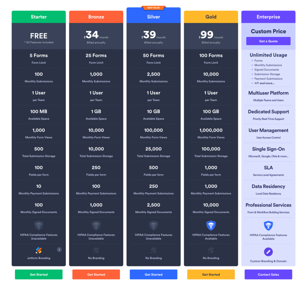 Jotform sets pricing plans for expected online form usage and offers a free starter plan for a 100-monthly submission limit. For larger corporate teams can consider enterprise solutions in an unlimited plan.