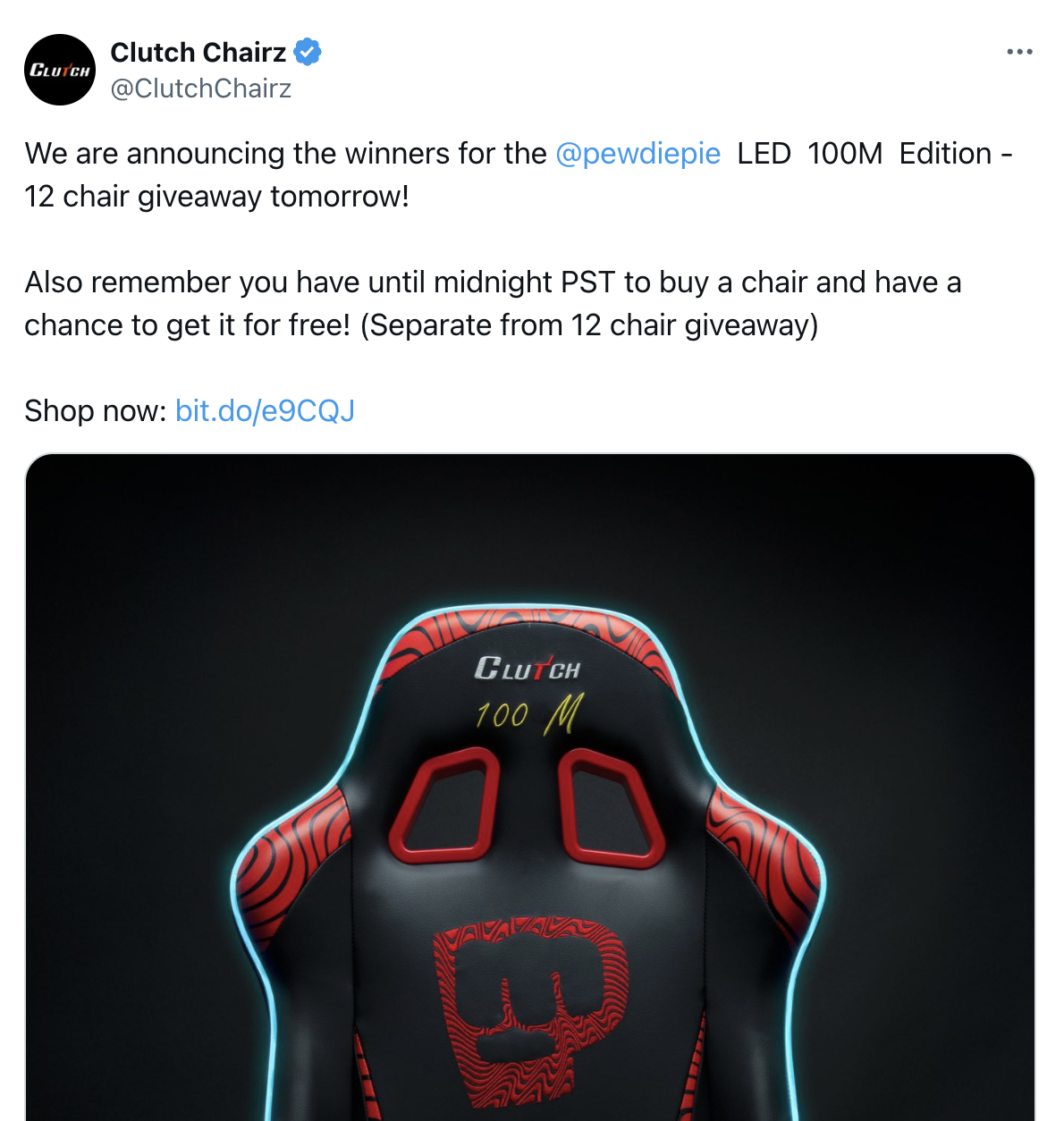Pewdiepie hosted the giveaway on his YouTube channel. However, Clutch Chairz Did cross-promote the campaign on X and other platforms (on their own channels/social profiles). Your brand should also cross-promote in this manner, be it on socials or email.