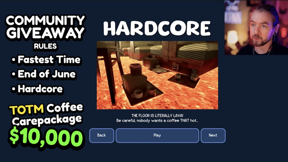 Users must play a fan-made coffee game on the hardest level. The person with the fastest time wins. Entrants must record their gameplay to submit their entry.