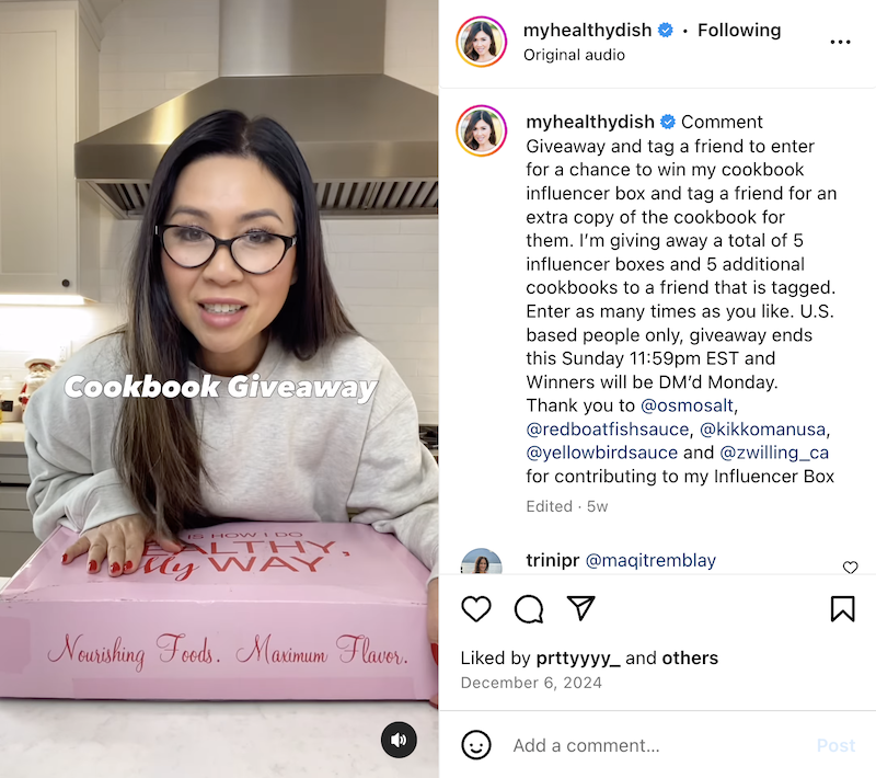 The additional products she included in her prize bundle are from food brands that are currently collaborating with her. My chose to go with a video post to explain the entry method better and to show off the actual prize. She also made sure to tag every brand featured in the giveaway.