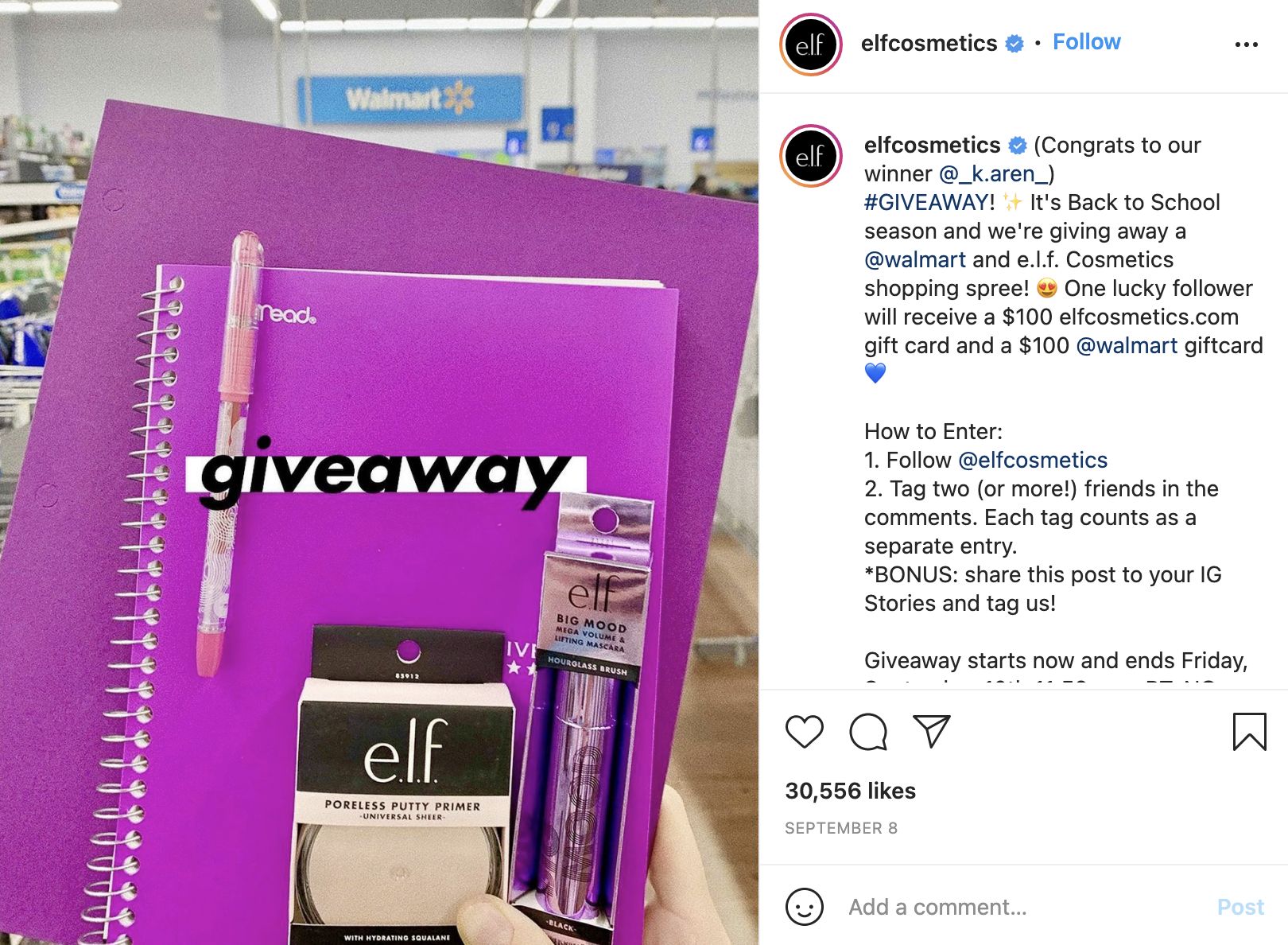 E.g. e.l.f cosmetics run a giveaway on Instagram every 2-4 weeks. The latest giveaway is a collaboration with Walmart wherein one lucky winner will get gift cards from e.l.f cosmetics and Walmart.