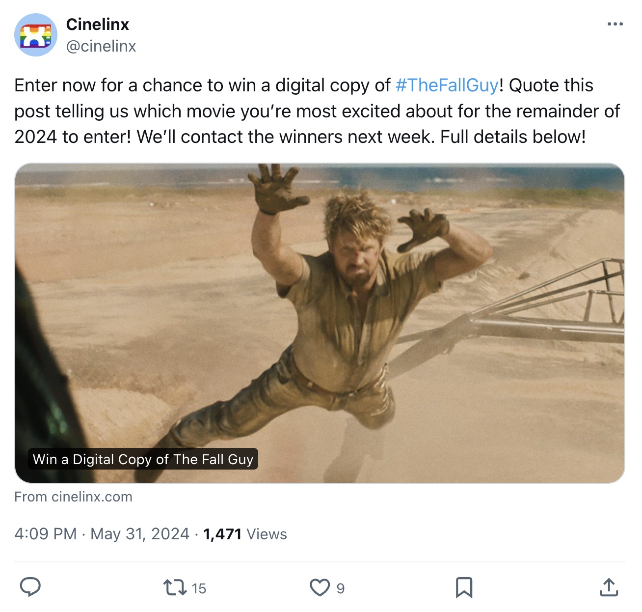 For The Fall Guy giveaway mentioned earlier, users had to go over to Cinelinx Twitter to retweet the giveaway post and comment to enter. Cinelinx goal was to build engagement on their Twitter profile while assisting Universal Pictures in creating exposure for the film.