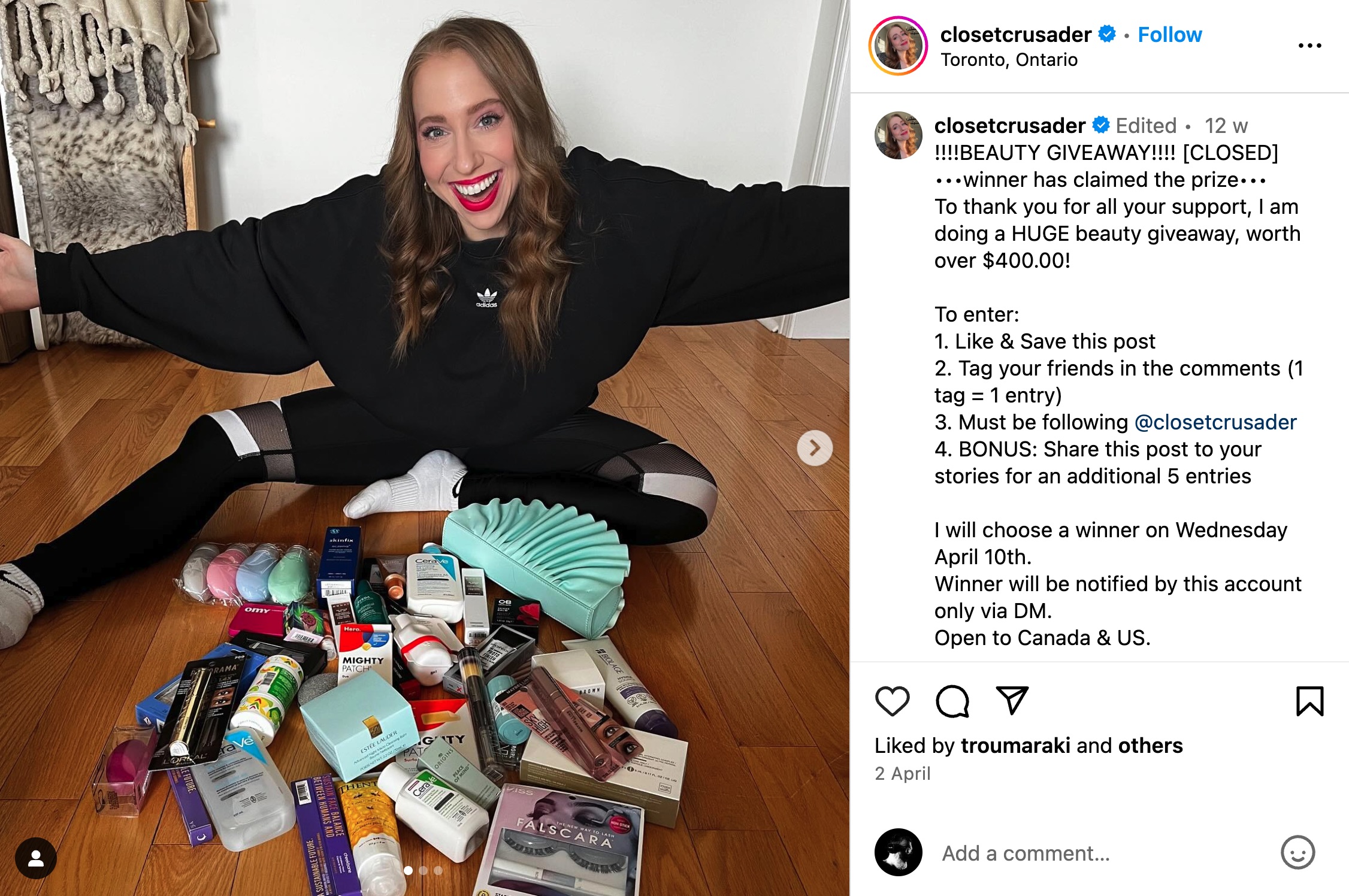 Loads of influencers and small businesses often host giveaways on their social media platforms. Some examples of these brands include: