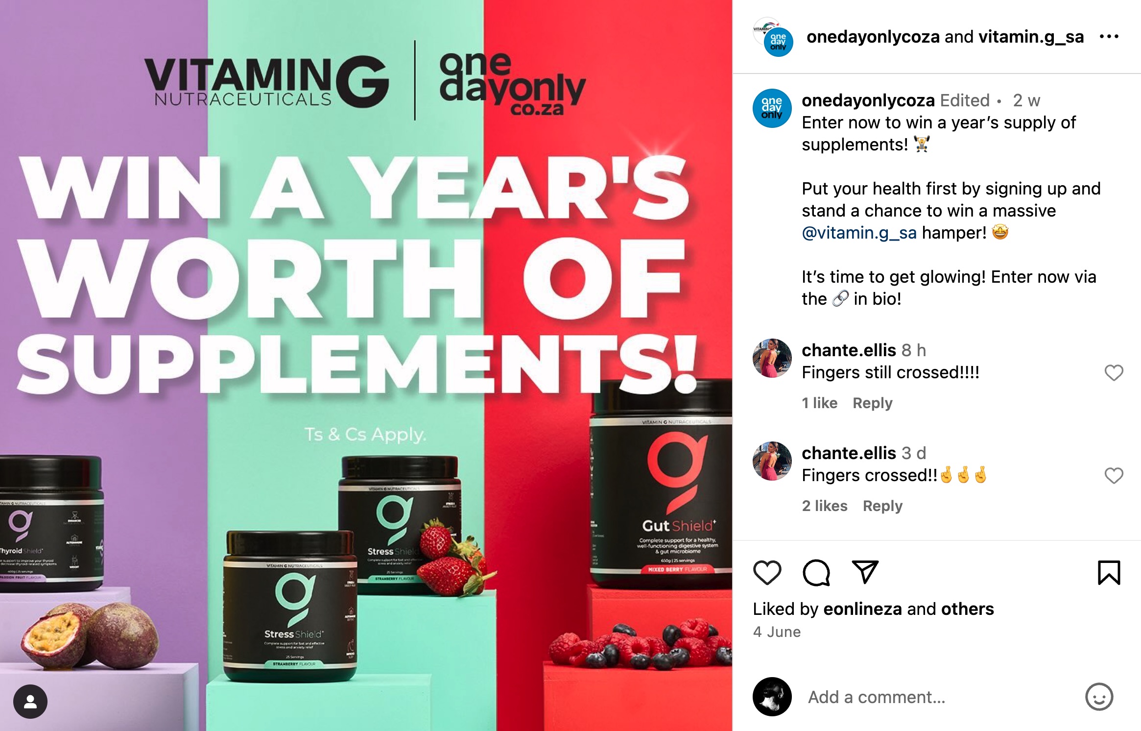 OneDayOnly’s recent campaign shows the success of a giveaway. By providing a year’s supply of vitamin G pills, OneDayOnly drew a large audience. Participants just needed to visit the link in their Instagram bio and sign up, making the entry process simple and accessible.