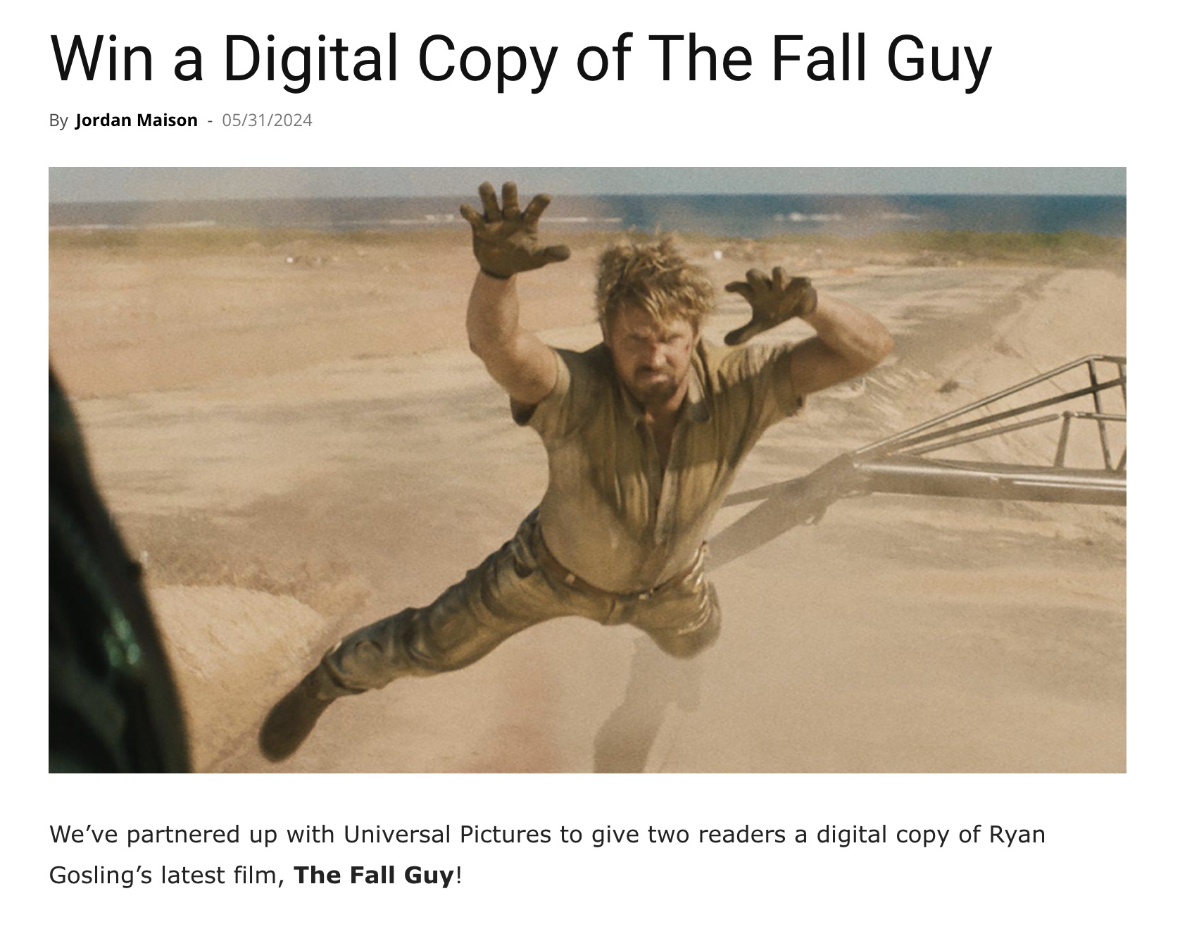 - Movie Studios can give away movie tickets and more to create exposure for a new movie release. Cinelinx gave away a digital copy of The Fall Guy to promote the release of the movie (See screenshot below).