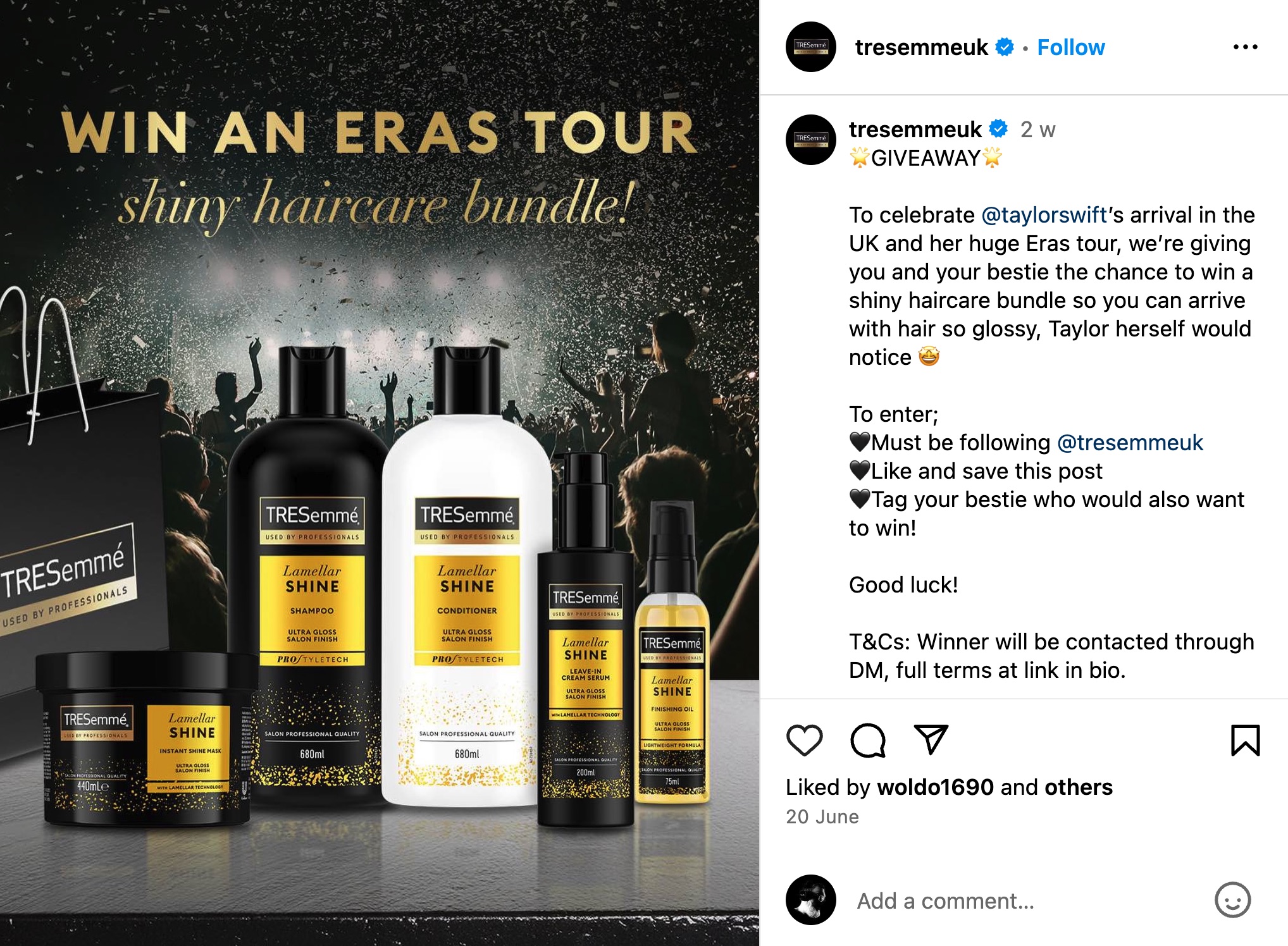 TRESemmé UK recently held an Instagram giveaway to celebrate Taylor Swift’s highly anticipated Eras Tour in the UK. TRESemmé uses social media to increase brand awareness, improve customer connection, and cultivate a devoted community by providing a glossy haircare bundle and engaging followers through a series of interactive activities.