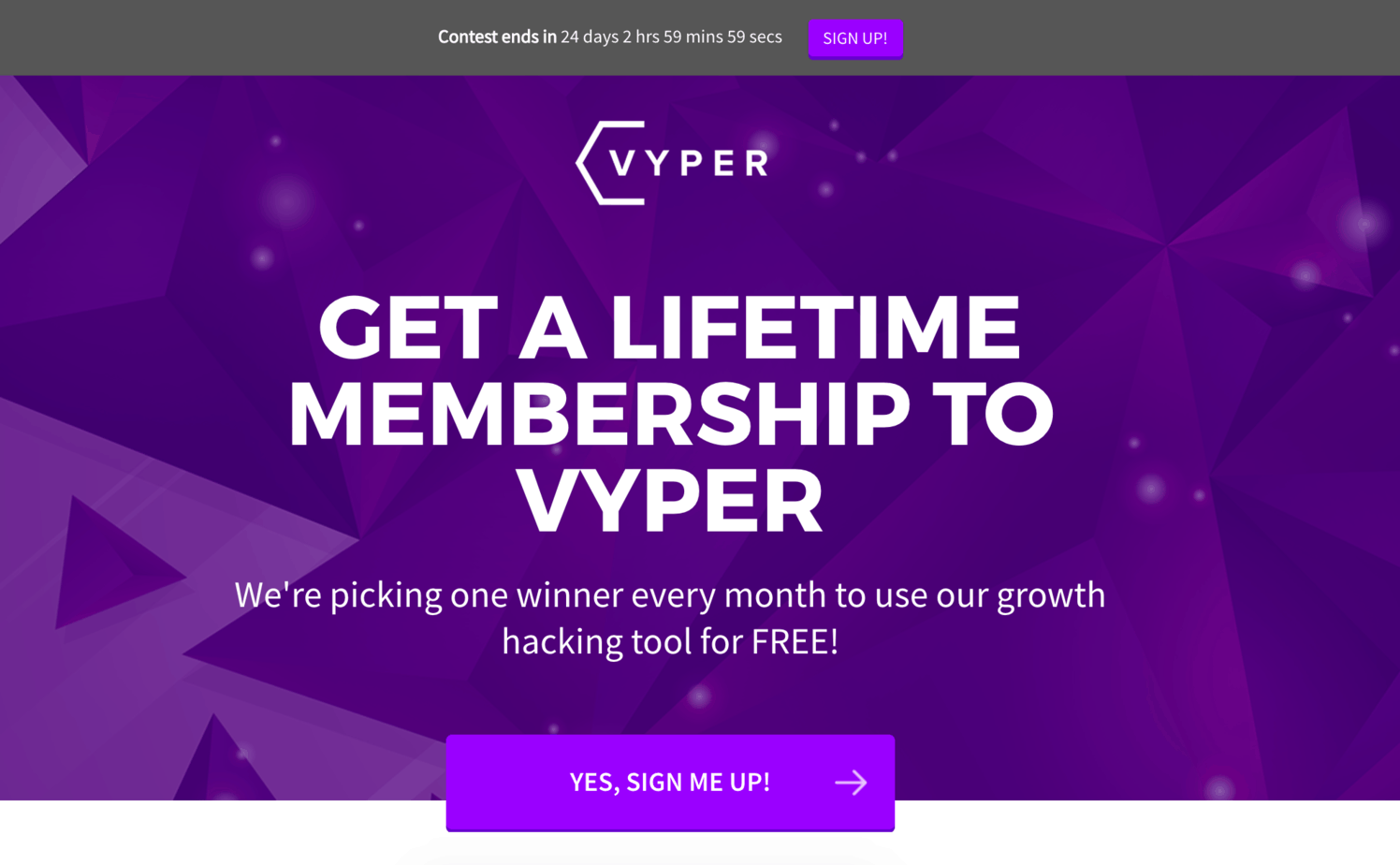 The idea of this is to keep a constant stream of traffic running to this contest page to keep it alive. Here is an example of how we run an evergreen contest – https://vyper.io/c/199