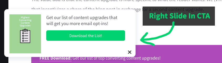 We have now added the option to choose a CTA bar or slide in pop to make your content upgrade stand out even more! You can see this in action on this post!