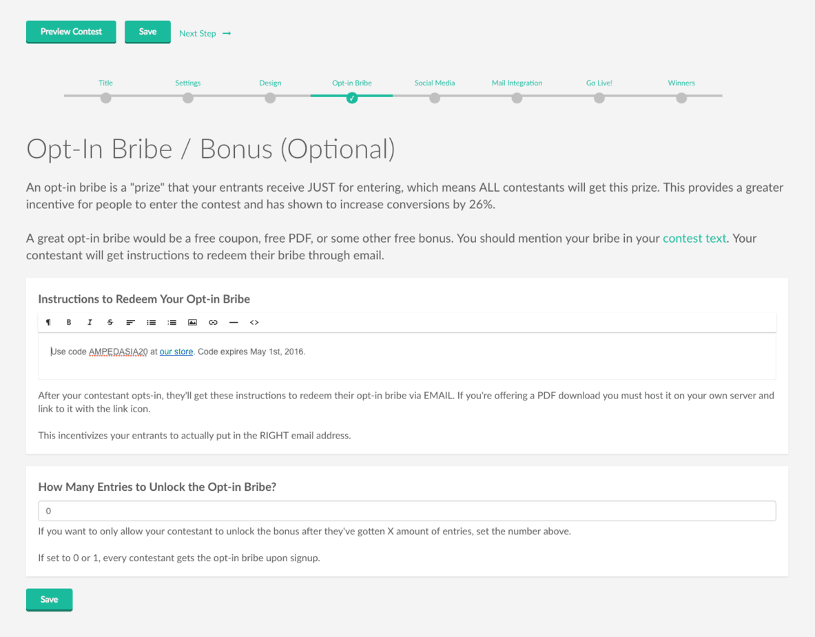 Then on the second box you can choose to allow only contestants with X amount of entries to unlock the bribe. When your contestant reaches this amount of entries, they’ll automatically be sent the bribe via email.