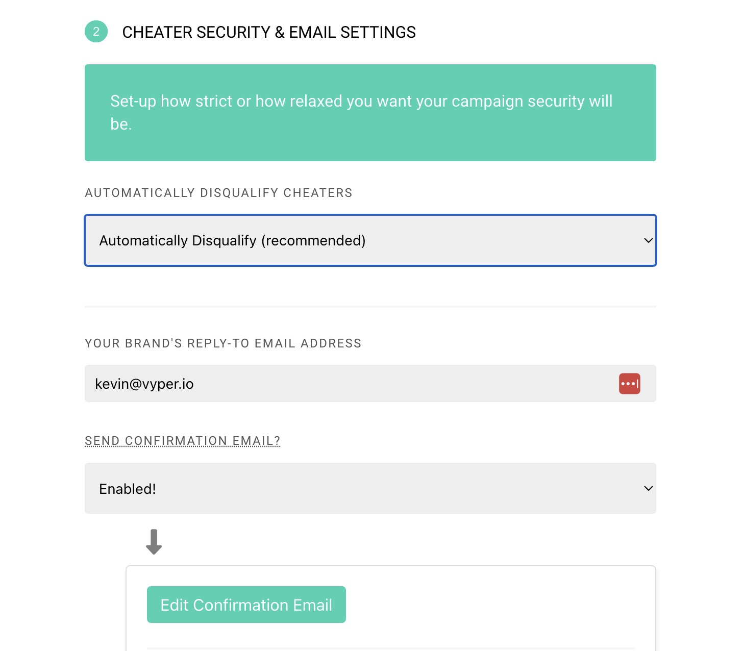 You can also set up ‘Automatic Disqualification’ with VYPER. This feature allows you to automate disqualification by removing entrants who continuously spam fake emails or cheat during the campaign.