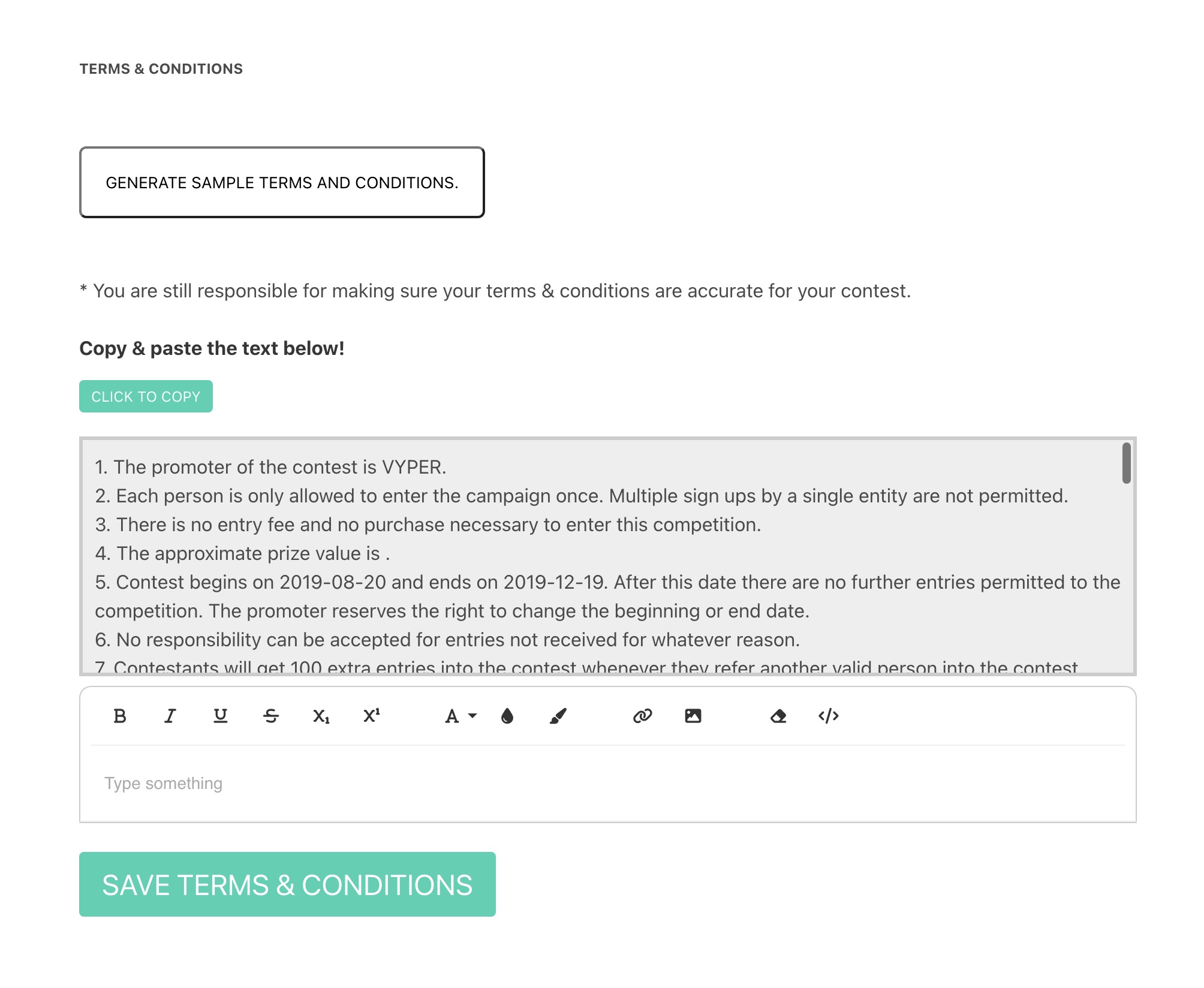On the page above, you can generate a list of Ts & Cs, which you can copy into the text editor. You can edit the content to include information relevant to your giveaway or contest.