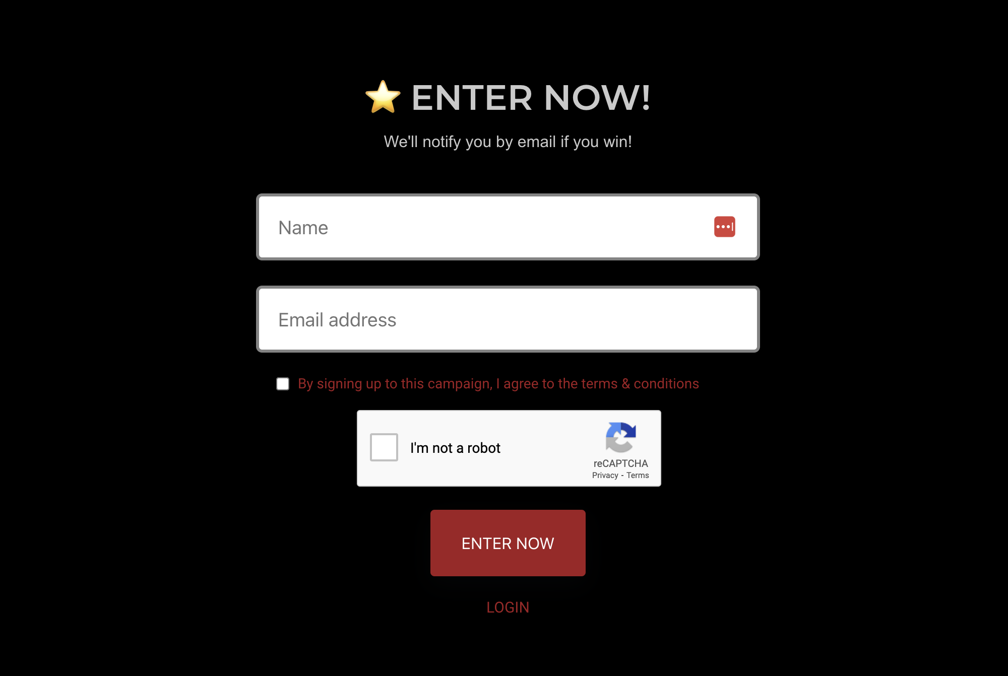 - Fill out this form to enter – Let users fill out a simple form with their name and email to enter the giveaway. This is ideal for collecting email addresses and new account signups.