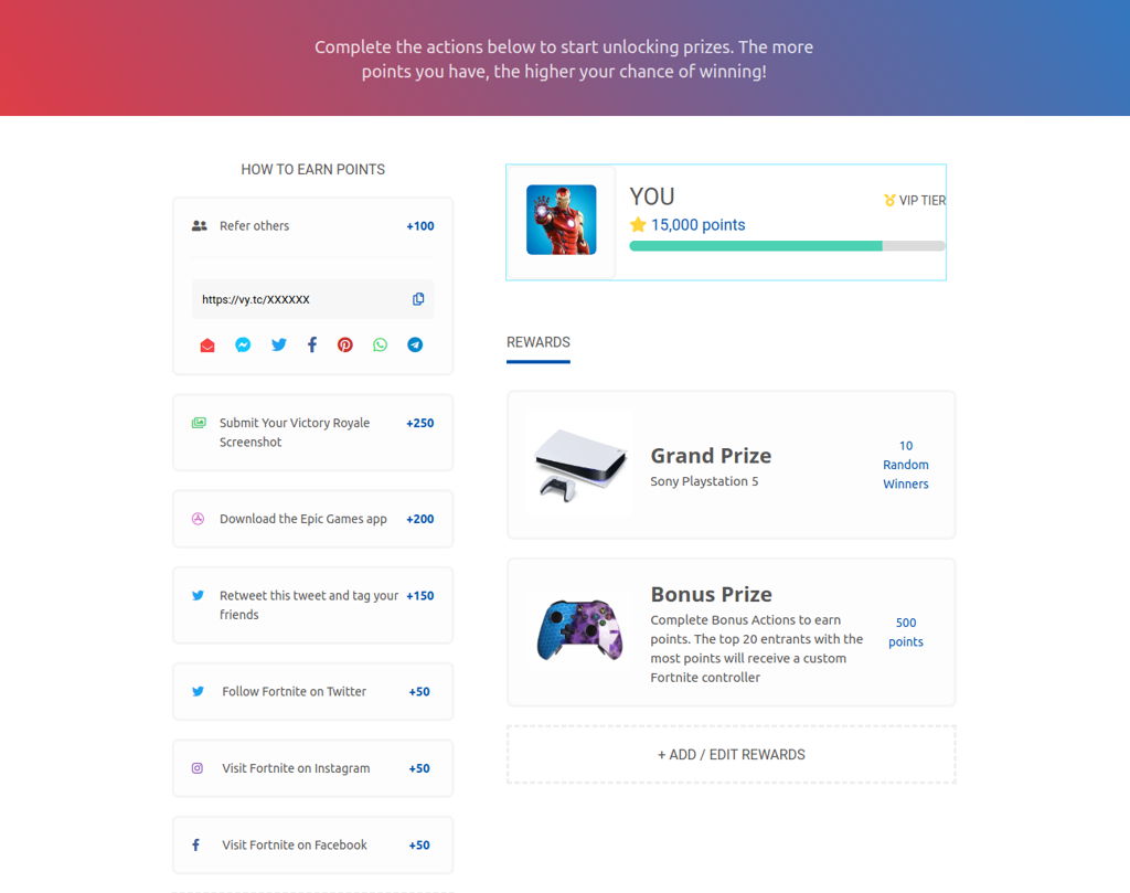Giveaway platforms like VYPER allow brands to add “Bonus Actions” functionality to their giveaways. This means that entrants can submit more entries, refer others, engage on socials, download apps, and more. Every action will earn an entrant additional points that will boost their chances of winning.