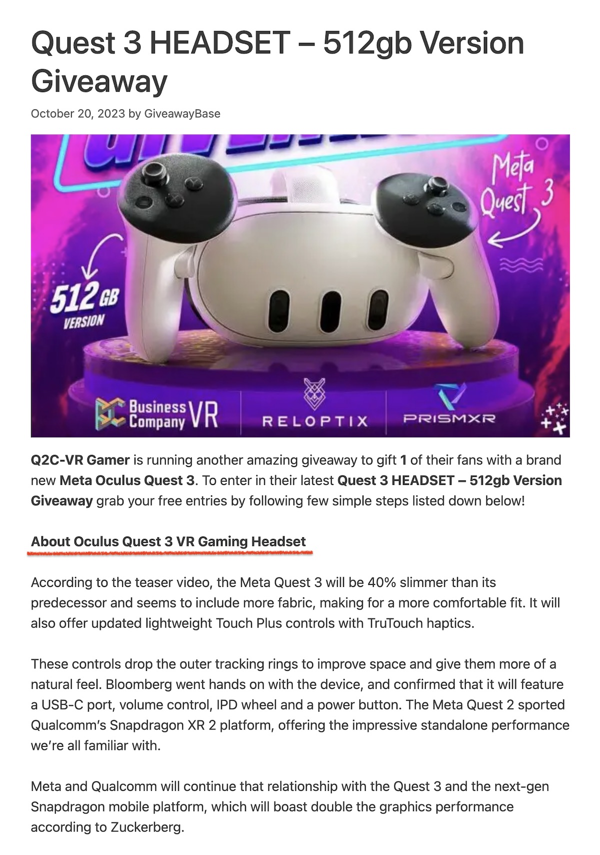 The abundance of info regarding the VR headset can help entice people further to enter the giveaway. An official Meta Quest 3 video is embedded further down the page. Videos are an excellent way to deliver info quickly to an audience and show off the prize’s best parts.