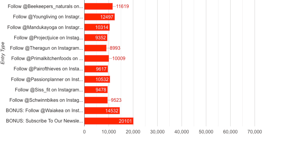Waiakea came out on top with 14,532 direct Instagram followers from the giveaway, but over the period of the contest their account reported additional organic followers as well.