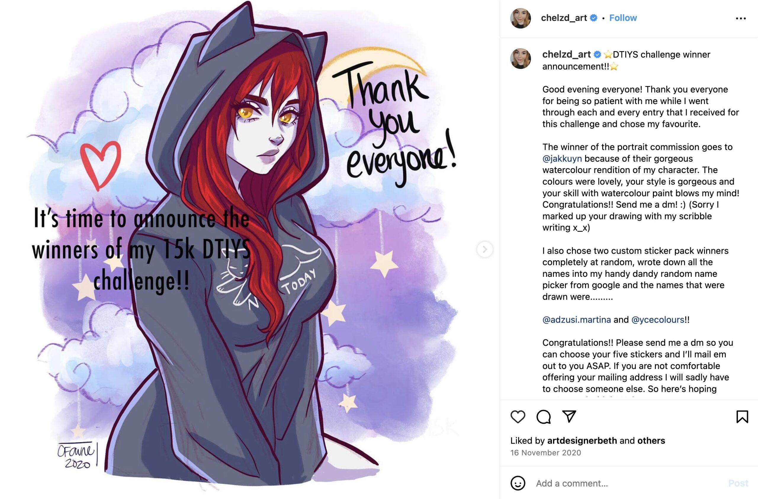 Artist Chelsea Chira hosted a drawing contest on Instagram. She created a post just to announce the winners (Screenshot below).