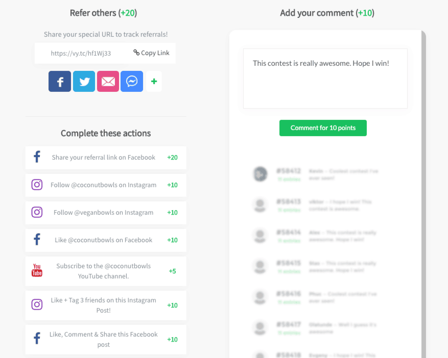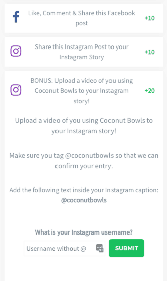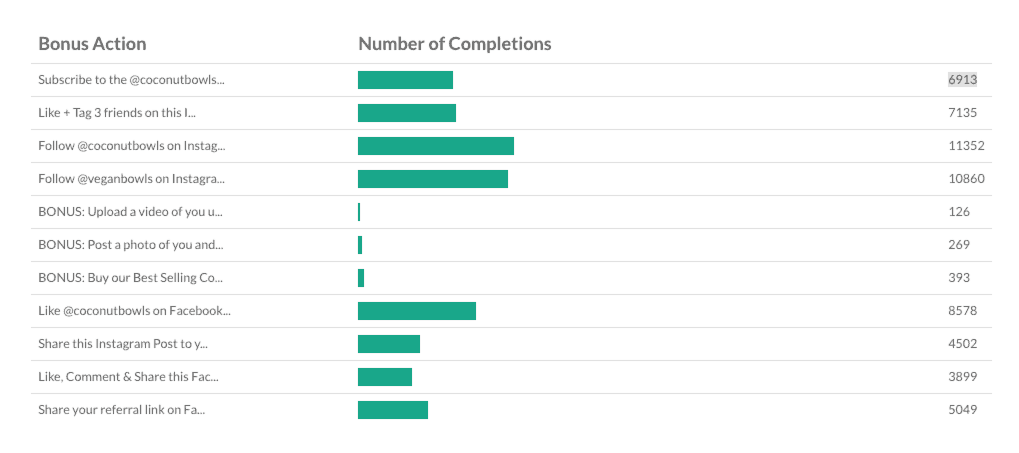 Above is an example of the VYPER contest page. You can see that Coconut Bowls had a lot of social engagements added as bonus actions in their giveaway.