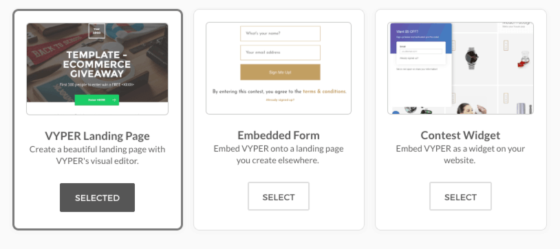 The VYPER landing page is the easiest way to run your giveaway, but the widget will help convert more website traffic while the embed option gives you a huge amount of customization.