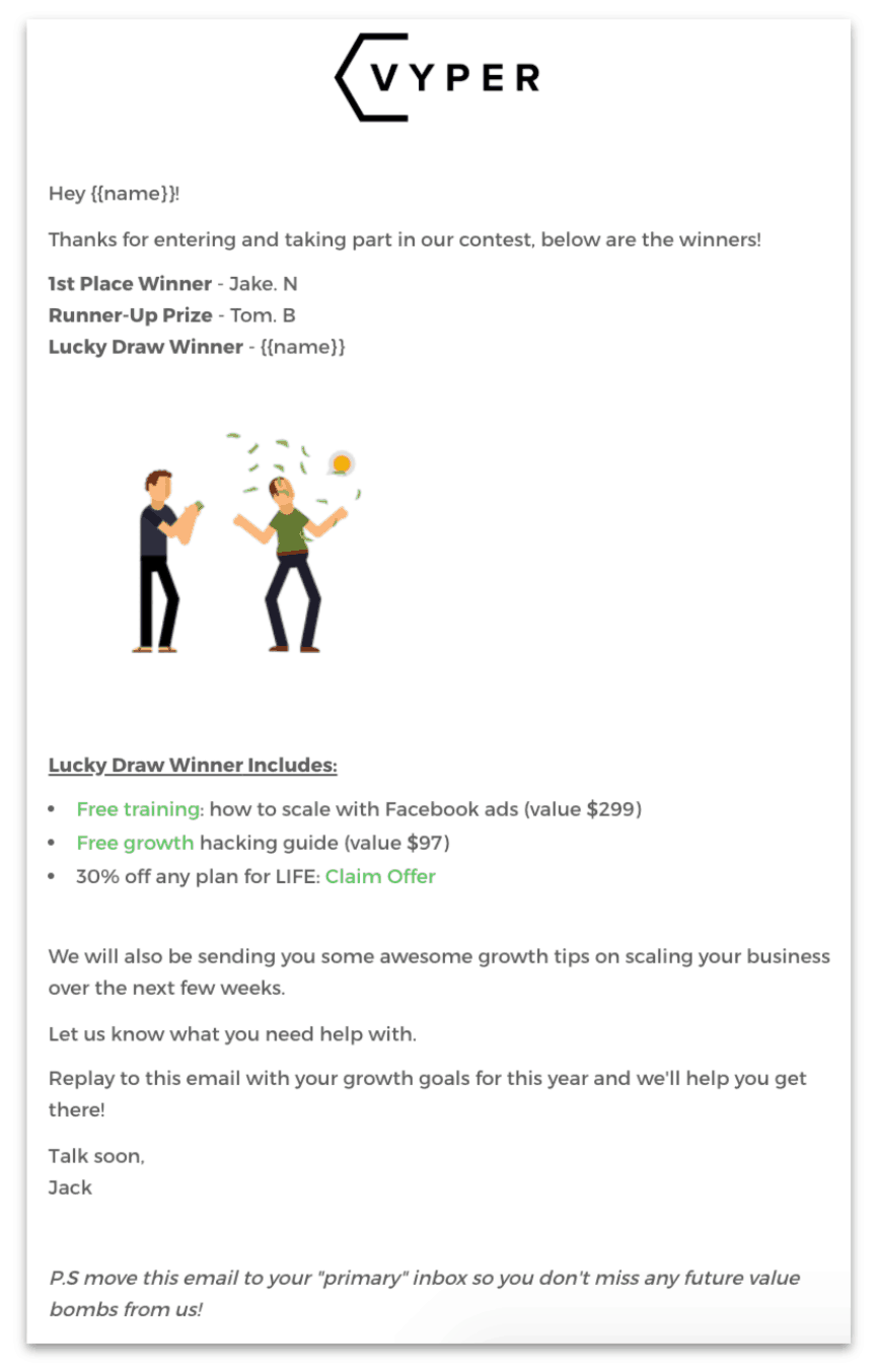 The winner announcement email is also a good time to pitch a sale as you have got such a high open rate. You can see this in the example email we sent for one of our contests.